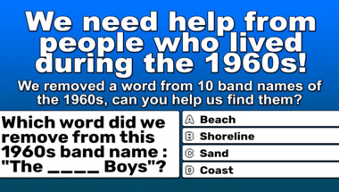 6/10 is what people on average are scoring in this 1960s bands with a missing word quiz so far. Are you ready to answer questions like "Which word did we remove from this 1960s band name : "The ____ Boys"?" and "Which word did we remove from this 1960s band name : "Ike & Tina ____"?"
