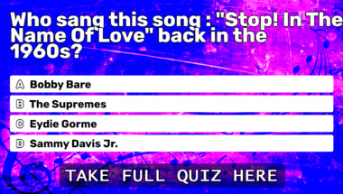 In this fun trivia quiz we're going to ask questions like "Who sang this song : "Stop! In The Name Of Love" back in the 1960s?" and "Who sang this song : "Up On the Roof" back in the 1960s?".