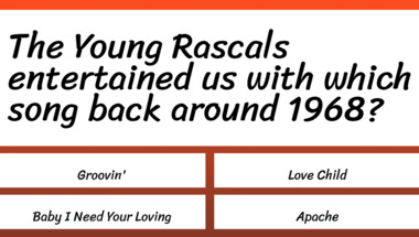 4/10 is what people on average are scoring in this 1960s Songs quiz so far. Are you ready to answer questions like "Bobby Darin entertained us with which song back around 1960?" and "The Young Rascals entertained us with which song back around 1968?"
