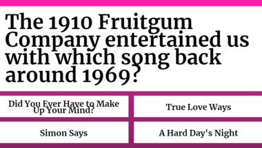 4/10 is what people on average are scoring in this 1960s Songs quiz so far. Are you ready to answer questions like "The Monkees entertained us with which song back around 1967?" and "The 1910 Fruitgum Company entertained us with which song back around 1969?"