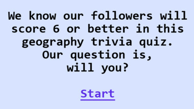 6/10 is the score to beat in this Geography quiz to put yourself over the average quiz taker. But you're probably going to be able to answer questions "Which of these countries is the smallest by area?" and "Which geographical feature can contain meanders and rapids?" easy!